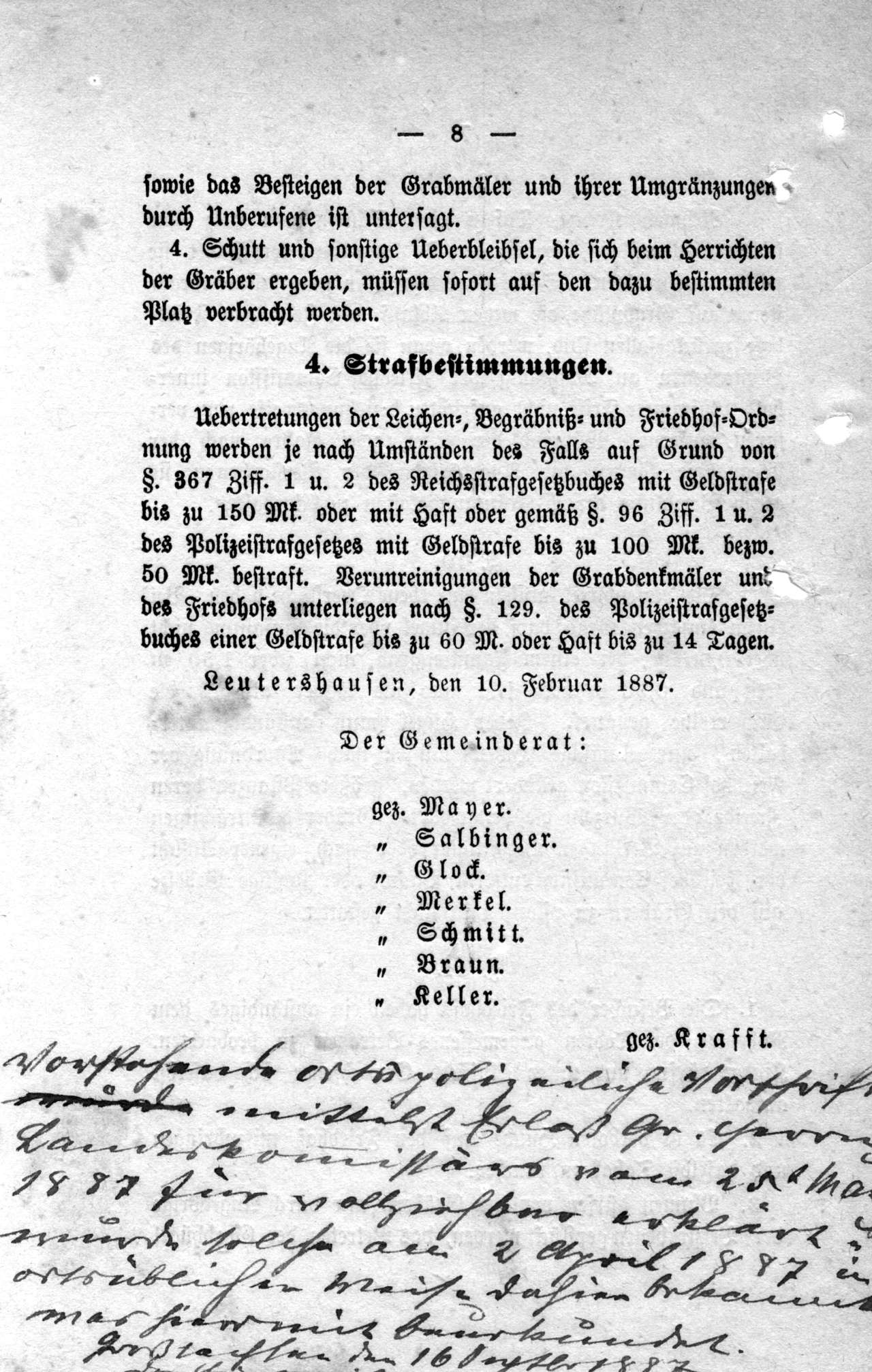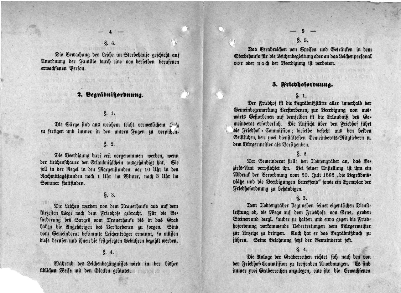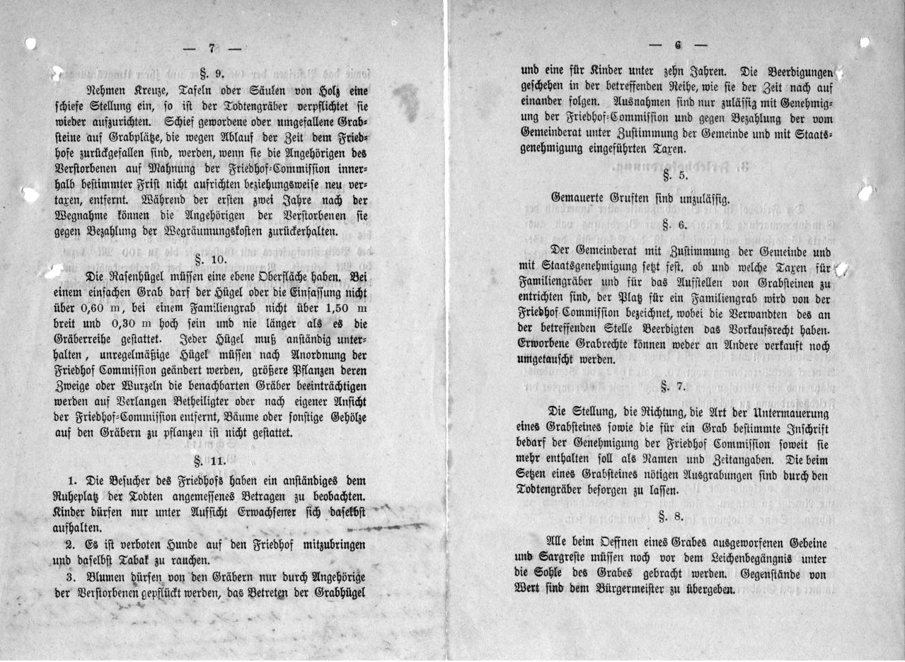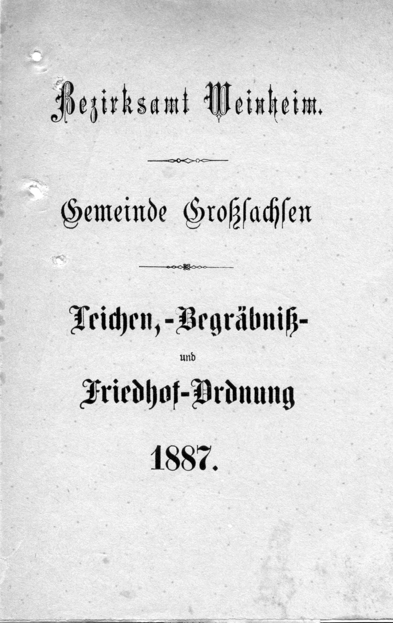 Friedhof Großsachsen Ein Bericht von Rainer Gutjahr Wie bereits angedeutet, brachte das vordringende Christentum eine neue Begräbnissitte in die bislang heidnische Umgebung mit: die Christen legten den Toten keine Beigaben mit ins Grab und bestatteten ihre Verstorbenen bei ihren Kirchen, die somit vielfach zum regelrechten Mittelpunkt der Fried- oder Kirchhöfe wurden. Gerade in Leutershausen zeugt die Lage von (evangelischer) Kirche und Friedhof bis heute von dieser Begräbnissitte, die sich auch an der Bergstraße nach der Einbeziehung dieses Raumes in das Merowingerreich allmählich durchgesetzt haben muss. In Großsachen ist der ursprüngliche Zusammenhang von Kirche und Friedhof verwischt, lässt sich aber aus der schriftlichen Überlieferung wieder herstellen. Der erste Kirchhof der Sachsenorte dürfte bei der längst verschwundenen Kirche des heiligen Jakobus d. Ä. auf der Höhe über dem Hohensachsener Ortskern gesucht werden, wo noch Ummauerung und Tore auf den typischen Kirchhof hinweisen. Mit der Schenkung des Grafen Liuther in Hausen kam 877 auch eine Kirche in den Besitz des Klosters Lorsch. Es wird als wahrscheinlich angenommen, dass dies die spätere Leutershausener Pfarrkirche war, an die sich der entsprechende, ebenfalls von einer Mauer umwehrte Friedhof anschloss. Es lässt sich freilich allenfalls vermuten, nicht aber mit Bestimmtheit sagen, dass sich auch schon bei der „basilica“ des Grafen Liuther ein Kirchhof befand. Ein erster Hinweis auf den Großachsener Friedhof findet sich vielleicht im Zentweistum der „zent zu Sassenheim“ vom 27. November 1430. Hier heißt es, dass das Zentgericht „by der kirchen Marie Magdalen“ tage. Tatsächlich dienten die Friedhöfe im Mittelalter vielfach als Tagungsort der sich unter freiem Himmel versammelnden Gerichte. Einen ersten urkundlich gesicherten Hinweis auf den Großsachsener Friedhof finden wir in einem Berain von 1475, demzufolge ein Haus und Hof, gelegen „an Sant Margen Magdalen Kirchoff“, 5 Viertel Wein an „Sant Margen Magdalen“ zinste. Den nächsten sicheren Beleg für den Friedhof zu Großsachsen liefert uns das „Wormser Synodale“ von 1496. In diesem Visitationsbericht über die kirchlichen Zustände im Bistum Worms werden die Friedhofsmauer - „murus coemiterii“- und ein Beinhaus – „ossarium“- erwähnt. Der Zugang zu Friedhof war schlecht verwahrt oder die Mauer in vernachlässigtem Zustand, heißt es doch, dass die Schweine in den Kapellenfriedhof eindringen würden – „porci intrant coemiterium capellae - Anscheinend genossen die Schweine innerhalb des wahrscheinlich mit einem Zaun oder einer lebenden Hecke – Hag - umgebenen Ortsetters gewisse Freiheiten. Die mit der Reformation eingetretene Glaubensspaltung führte vielerorts zur Einrichtung gesonderter Friedhöfe für die jeweiligen Konfessionen. Nicht so in Großsachsen und Leutershausen. Hier bestatteten die katholischen und lutherischen Minderheiten, die sich im Laufe der Entwicklung in Kurpfalz herausgebildet hatten, ihre Toten auf dem gleichen Friedhof wie die reformierte Mehrheit, wenn auch gegebenenfalls in gesonderten Grabfeldern. Dass es unter solchen Verhältnissen ab und zu Spannungen zwischen den Konfessionen wegen der gemeinsamen Friedhöfe gab, lässt sich mit Sicherheit annehmen. So erreichte auf dem Instanzenweg über das Oberamt Heidelberg und die Zent Schriesheim im Februar 1768 ein „special gnädigster Befehl“ des Kurfürsten auch die Gemeinde Großsachsen. Dem Befehl zufolge war zu berichten „über daß Recht und Gebrauch in Errichtung steinerner Creutzer über die Grabstätte auff denen zwischen Catholicis und Reformatis oder Lutheranis gemeinschafftlichen Kürchhöffen“. In der Antwort des Großsachsener Schultheißen Matthias Brunner vom 24. Februar 1768 heißt es: „Bey hiesiger Gemeindt befindet sich ein gemeinschafftlicher Kirchhoff zwischen denen Catholicis, Reformatis et Lutheranis; es ist aber kein Recht in Errichtung steinernen Creutzen, sondern nur der Gebrauch von denen Catholicis eingeführet, daß derjenige, der die Mittel besitzet, ein von Holtz oder Stein gemachtes Creutz über die Grabstatt errichten darff, auff (irrtümlich für: auch) auff dem Kirchhoff, wo thunlich, ein steinernes Creutzen auffzurichten.“ Ein neuer Friedhof muss ungefähr um das Jahr 1700 angelegt worden sein, der sich auf der Höhe des heutigen Pfarrhauses von der Kirchgasse bis zum Haagackerweg erstreckte. Er wird fassbar durch einen Eintrag im Weinbedebuch von 1716, wo ein „Wingert bey der Kirchen, … geforcht unten der New Kirchhoff“ genannt wird. Die Erweiterung der Kirche nach dem Plan von F. Born um das Jahr 1725 beeinträchtigte den für den alten Kirchhof zur Verfügung stehenden Raum in bedeutende Maße. Diese Tatsache, verbunden mit dem im 18. Jahrhundert zu verzeichnenden Anwachsen der Bevölkerung, hätte die Anlage eines neuen Friedhofs ohnehin erforderlich gemacht. Wahrscheinlich bezog sich die oben zitierte Äußerung des Schultheißen Brunner bereits auf diesen „neuen“ Friedhof, über dessen Entstehungszeit man schon im darauf folgenden Jahrhundert nichts mehr Genaues wusste. 1865 verlangte das Bezirksamt Auskunft darüber, weshalb die Anlage dieses neuen Friedhofes „an einem in sanitätspolizeilicher Beziehung so wenig geeigneten Platze stattgefunden“ habe. Gemeinde und evangelisches Pfarramt konnten dem Bezirksamt die gewünschte Auskunft nicht geben, da sich in den entsprechenden Akten, wie auch in der Registratur des Bezirksamtes, dazu nichts fand. Man griff deshalb auf die altehrwürdige Methode zurück, betagte Gemeindebürger darüber zu befragen. Gehört wurden Altbürgermeister Kilthau, Konrad Siegmund und Georg Plaicher; sie erklärten, der jetzige Friedhof bestünde, so lange sie sich erinnern könnten; zwar seien noch die Angehörigen einzelner Familien bis 1813 oder 1816 auf dem alten Friedhof begraben worden, „warum, ist uns unbekannt, jedenfalls scheint uns dies 