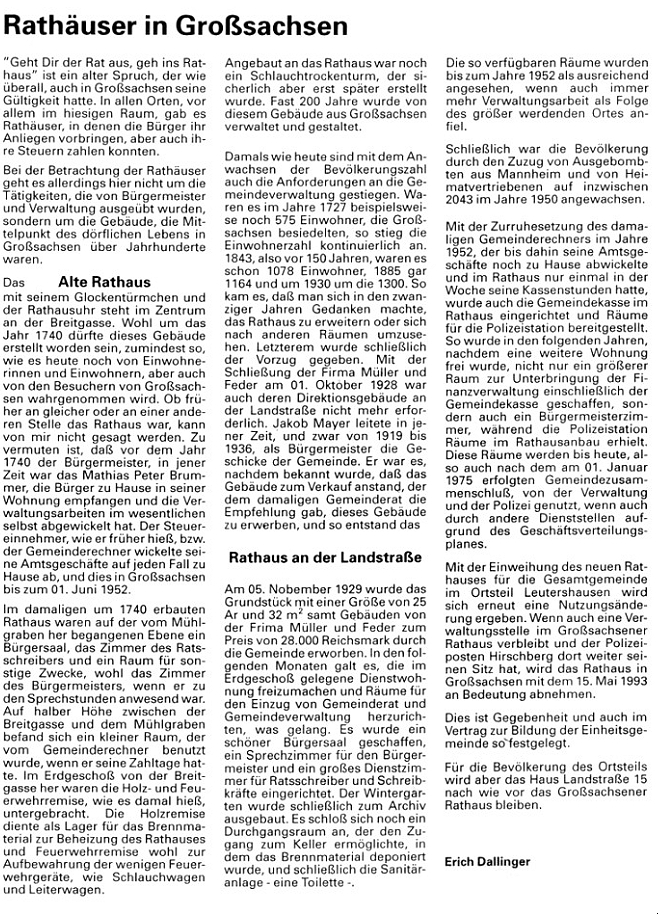 Die Zimmer im Parterre und im ersten Stock wurden mit sehr großen Öfen, ca. 2 Meter hoch, einen habe ich noch selbst gesehen, schön mit Kacheln verkleidet, beheizt. Es war die Arbeit der Bediensteten, jeden Morgen diese Öfen wieder neu zu füllen, sodass es im Parterre und im ersten Stock immer schön warm war. In den Gesindezimmern weiß ich nichts über die Beheizbarkeit, da habe ich nicht nachgefragt. Der letzte dieser Öfen wurde nach meinem Einzug aus dem Damensalon entfernt. Er wog etwa sieben Zentner. Ich weiß noch, dass die Leute unheimliche Probleme hatten, dieses schwere Monstrum die Treppen hinunter zu bringen. Auch erzählte mir die Tochter des Hauses, dass sie und ihre Schwester in England auf die Höhere Töchterschule geschickt wurden, um die Hauswirtschaft zu erlernen. Nur ihr Bruder durfte studieren, der dann auch in Heidelberg promovierte. Ich kann mich noch gut daran erinnern, wenn sie zu uns kam mit einem kleinen Teller und einigen kleinen Gebäckstücken und sagte: „Herr Eck, Sie müssen unbedingt mal kosten.“ Ich kann nur jedem Leser sagen, die Frau konnte wunderbar backen. Wenn ich sie fragte: „Wo haben Sie das gelernt?“, dann sagte sie immer „In England, auf der Schule.“ Ich war damals noch zu jung, um mir die Rezepte aufzuschreiben. Schade, Schade. Das Gebäck und die Kuchen schmeckten fantastisch, so etwas ist heute kaum noch zu finden. Auch ist das Rathaus großzügig unterkellert. Der sehr, sehr große Keller ist in zwei Teile unterteilt. Der hintere Teil liegt etwas tiefer und wurde als Brennmaterial-Vorratsraum benutz. Hier wurde der Koks über eine Rutsche in den Keller gebracht. Der heutige Anbau, der von der Polizei früher benutzt wurde, war damals noch nicht vorhanden, so dass von hier aus das Brennmaterial ohne Probleme in den Keller gebracht werden konnte. Der vordere Teil war der Weinkeller, wo auch das Eingemachte, Kartoffel, Kraut und Rüben, wie sie mir erzählte, untergebracht waren. Wie mir erzählt wurde, wurden des Öfteren Festlichkeiten veranstaltet, wo sich dann die Honoratioren mit ihren Ehefrauen trafen. Es wurde dabei beraten, was das Geschäftliche und das Dorfleben betraf. So ein Fest bedurfte zwei Tage Vorbereitung und es gab alles, was Küche und Keller zu bieten hatten. Nach einem opulenten Essen mit mehreren Gängen, wurden die Damen in den ersten Stock geschickt, wo die Dame des Hauses ihren Salon hatte. Hier wurde über die Neuigkeiten, Mode und sonstiges Gerede im Dorf geplaudert. Die Kinder durften bei diesen Treffen der Damen und Herren nicht dabei sein. Bei den Herren lief es ähnlich ab. Die Tochter des Hauses erzählte mir, dass während die Männer miteinander redeten, sie eifrig dem Wein und Tabakgenuss frönten. Das waren die Worte, die sie gebrauchte, nicht Rauchen oder Trinken. Manchmal wurde es auch laut im Herrensalon. Anscheinend war man dann nicht einer Meinung, aber nach zehn oder zwanzig Minuten war man sich dann wieder einig, wenn die Herren wieder lachten und fröhlich waren. Nach ungefähr drei Stunden ihres Disputs sah man sie im Garten auf und abgehen, um die vom Wein und Tabakgenuss erhitzten Köpfe abzukühlen. Die Kinder sahen dann die Herren in einer Runde stehen, wo sie sich vor Lachen kaum an sich halten konnten. Wahrscheinlich hat man sich dann irgendwelche Zoten erzählt. Es kam auch vor, dass Herr Feder ein oder zwei seiner Kutschen vorfahren ließ. Dann fuhren die Herren über Land, was manchmal bis zum nächsten Morgen dauern konnte. Ihr Vater war an so einem Tag ziemlich unleidlich. Wenn sie ihn dann fragte, was denn los sei, meinte er, bei dem Destillat, was sie genossen hätte, muss etwas falsch gewesen sein, aber das würde schon wieder werden. Sie solle sich keine Sorgen machen. Am nächsten Tag war er auch wieder der Alte. Die Erziehung der Kinder oblag der Mutter. Die Schule, Kleider, Herzensbildung und das Studium ihres Bruders. Nur bei ganz großen Entscheidungen hatte der Vater das letzte Wort. Gab es einmal bei den Kindern Kummer oder Sorgen, dann sagte die Mutter immer, dies sei kein Grund, die Contenance zu verlieren und sich in Tränen aufzulösen. Das nächste mal müsse man halt besser aufpassen. Eine ältere Frau hier in Großsachsen meinte: „Die Hartmanns, das war eine sehr vornehme und feine Familie.“ Also stimmte doch alles, was ich erzählt bekommen hatte. Was ich nicht wusste war, dass sie eine geborene Hartmann war. Ich konnte keinen Bezug zu Müller & Feder herstellen, bis mit die alte Dame aus Großsachsen die Zusammenhänge erklärte. Einige Zeit später zogen wir dann in den zweiten Stock, sodass der Kontakt etwas weniger wurde. Bald darauf zog sie auch von Großsachsen weg. So ging eine Ära des Hauses zu Ende und eine neue begann. Die Firma Müller & Feder ging ihrem Ende zu und wurde von der Bast AG übernommen. Das Haus wurde dann im Jahre 1928 von der Gemeinde Großsachsen gekauft und zum Rathaus umfunktionier. Die Außenbeschriftung RATHAUS über dem Hauptportal, für jeden gleich sichtbar, wird noch lange daran erinnern. Die oberen Stockwerke waren als Wohnungen vermietet und im Parterre und im seitlichen Anbau residierten die Gemeindeverwaltung und die Polizei, die später ins Rathaus einzog, aber inzwischen schon wieder aufgelöst wurde. Das Rathaus war Mittelpunkt des Ortes und der Gemeindeverwaltung, bis zum Mai 1993, als das neue Rathaus in Leutershausen eingeweiht und bezogen wurde. Dieses Haus hat schon viel gesehen und erlebt. Bewohner wurden hier geboren und starben. Es hat zwei Kriege unbeschadet überstanden und sogar den verheerenden Dachstuhlbrand im Mai 2003. Ich hoffe, dass es weitere hundert Jahre bestehen bleibt und wie damals seine Erbauer und jeweiligen Bewohner, beschützt vor Hitze, Kälte und sonstigen Unbill. Ich möchte hier der Vollständigkeit halber einen Bericht von Erich Dallinger anfügen, den er im Mai 1993 anlässlich der Ratshauseinweihung schrieb und danke ihm für die Genehmigung, ihn hier veröffentlichen zu